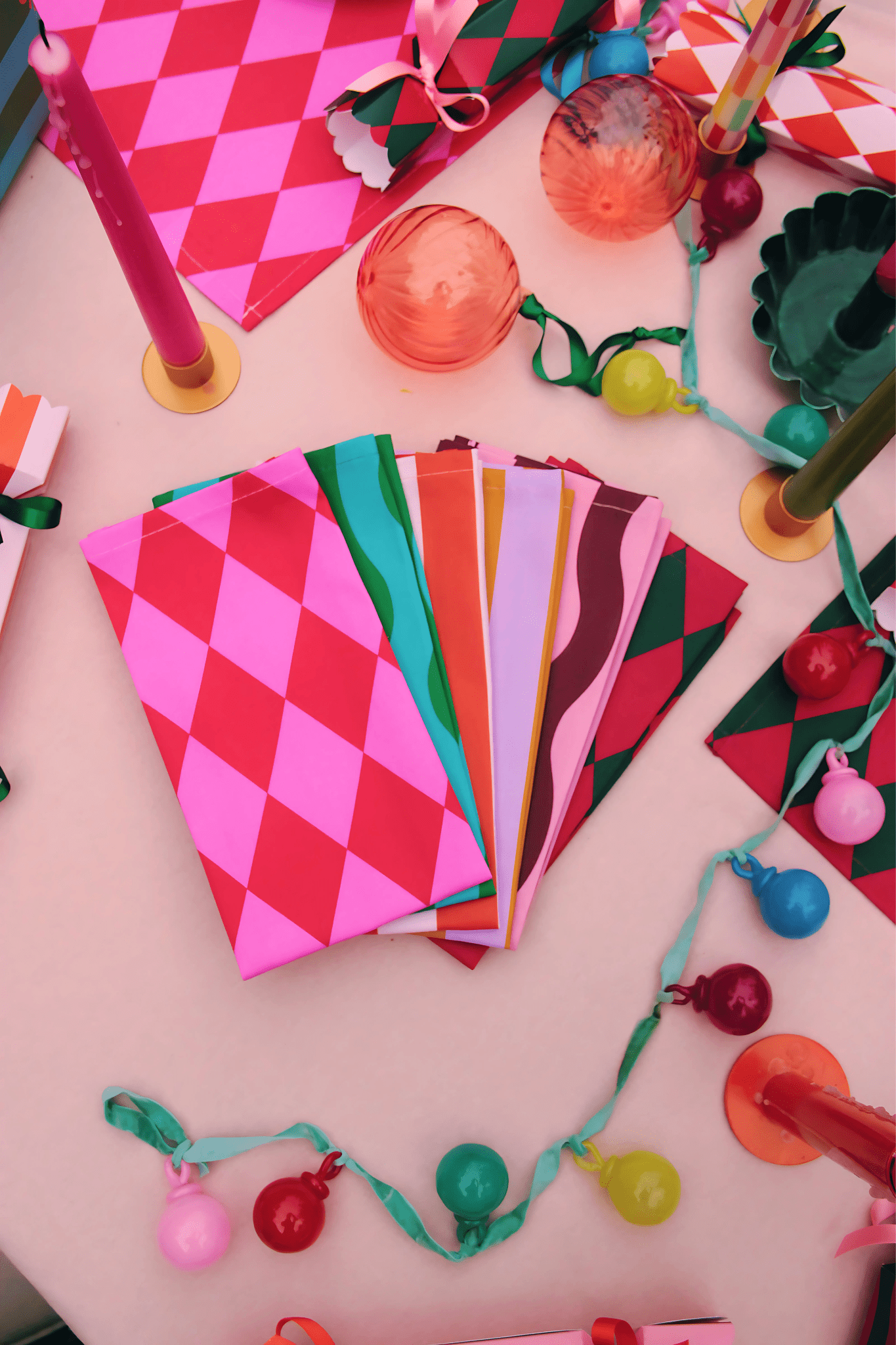 Bring joy to your table with these vibrant, multi-use placemats or napkins! Made from 100% cotton stripe, checkered and harlequin designs in a festive colour palette, this set of 2 is perfect for adding a modern twist to your holiday décor. Whether you’re setting the table for Christmas dinner or using them as stylish napkins for your festive feast, these pieces will make your holiday gatherings feel extra special.