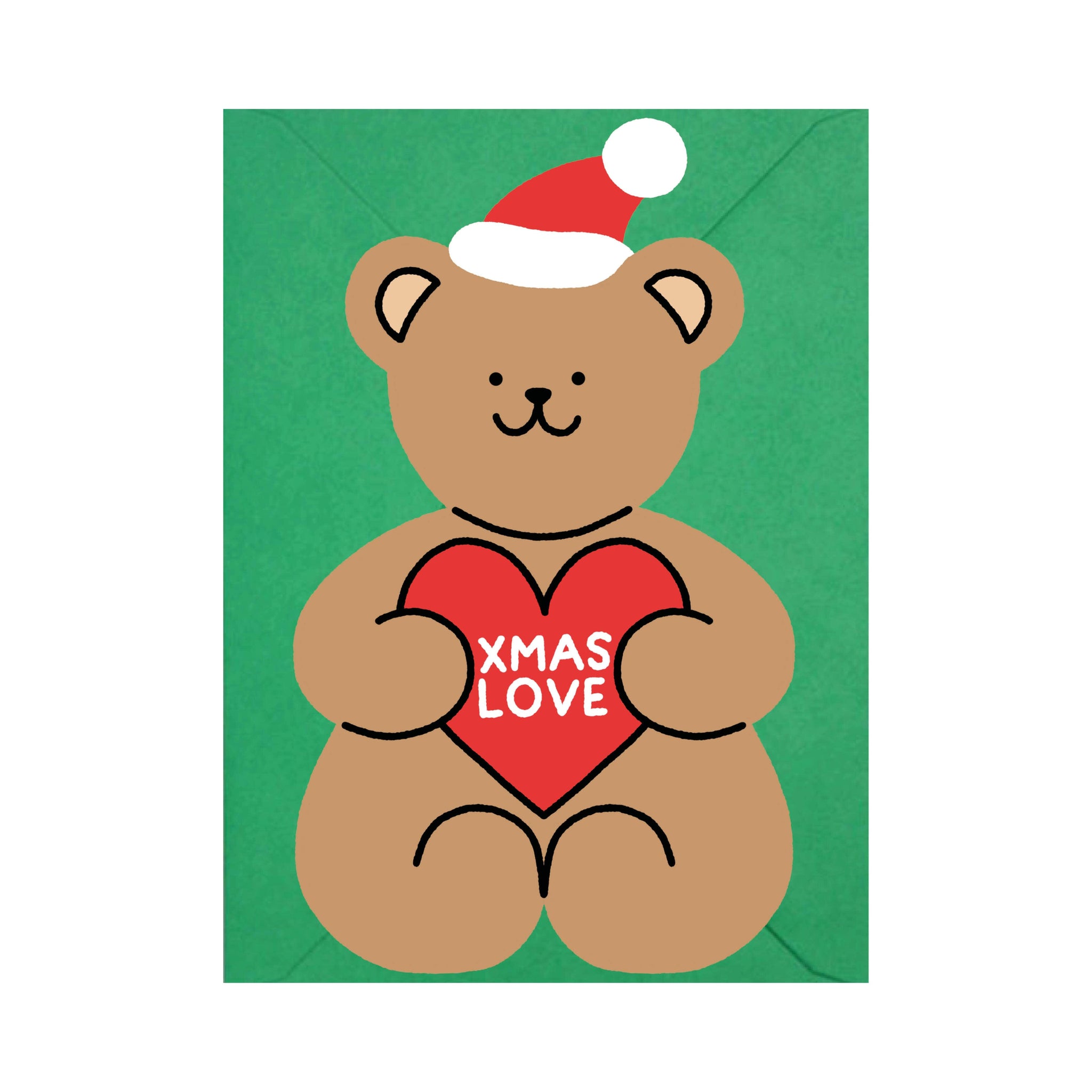 Spread festive cheer with this adorable Christmas card featuring a teddy bear holding a heart that reads "Xmas Love."