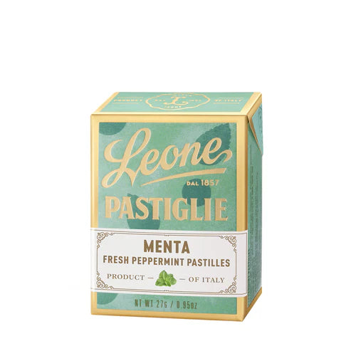 Leone’s alpine-fresh Peppermint candy sweets are still produced according to a traditional Italian recipe that dates back to 1857. The first step in production involves mixing cold powdered sugar grounded for purity, Arabic Gum and tragacanth with the addition of water, fruit juices, peppermint essential oil, natural extracts and colouring according to taste. The mixture is then kneaded carefully dried over a period of 36 hours to ensure final product has an even, consistent flavour. Made in Torino, Italy in the original candy shape.