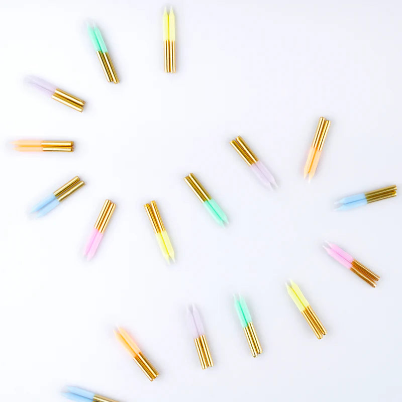 Dim the lights, a rainbow of colors is here! Let everyone know it's a special birthday with this wonderful display of mini birthday candles. Pastel perfection mixed with elegant gold. Place them all, or just a mix, on the birthday cake, depending on the effect you want to achieve. An ideal candle set to keep in your store cupboard, ready to brighten up any sweet treat in seconds. They also look great on cupcakes, and make a fabulous host gift too.