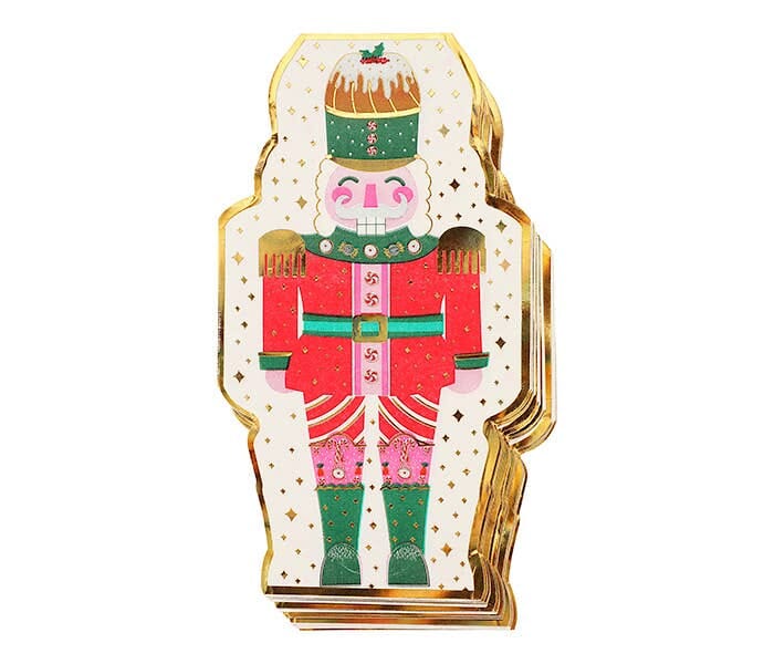 These festive guest towels feature a cheerful nutcracker design decked out in vibrant red, pink, green, and gold with playful details like a holly-topped hat and glittery accents.