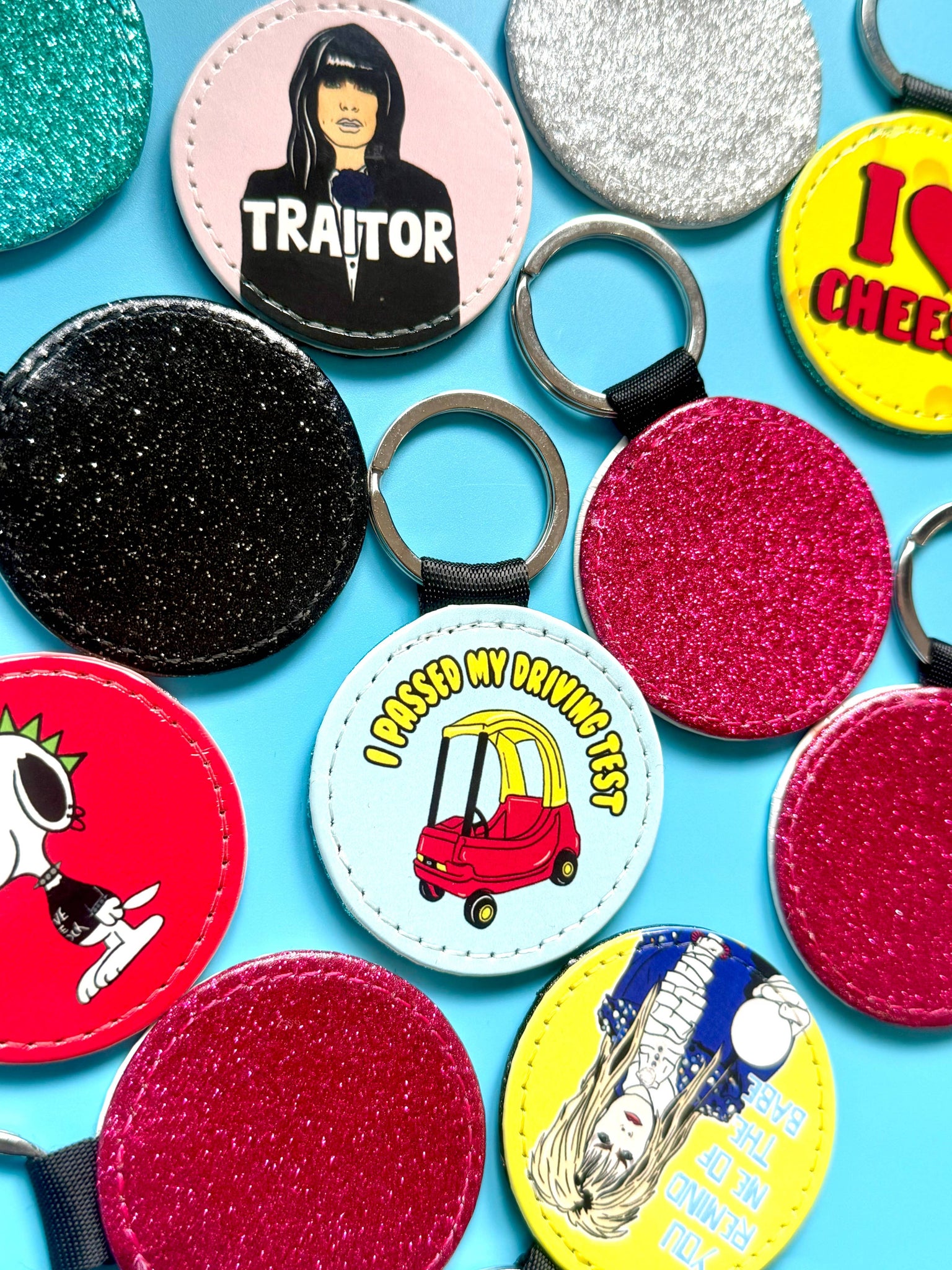 Faux Leather glitter Keyring designed and printed in house by Bite Your Granny, backing glitter colours will vary. Measurements: Picture 5cm