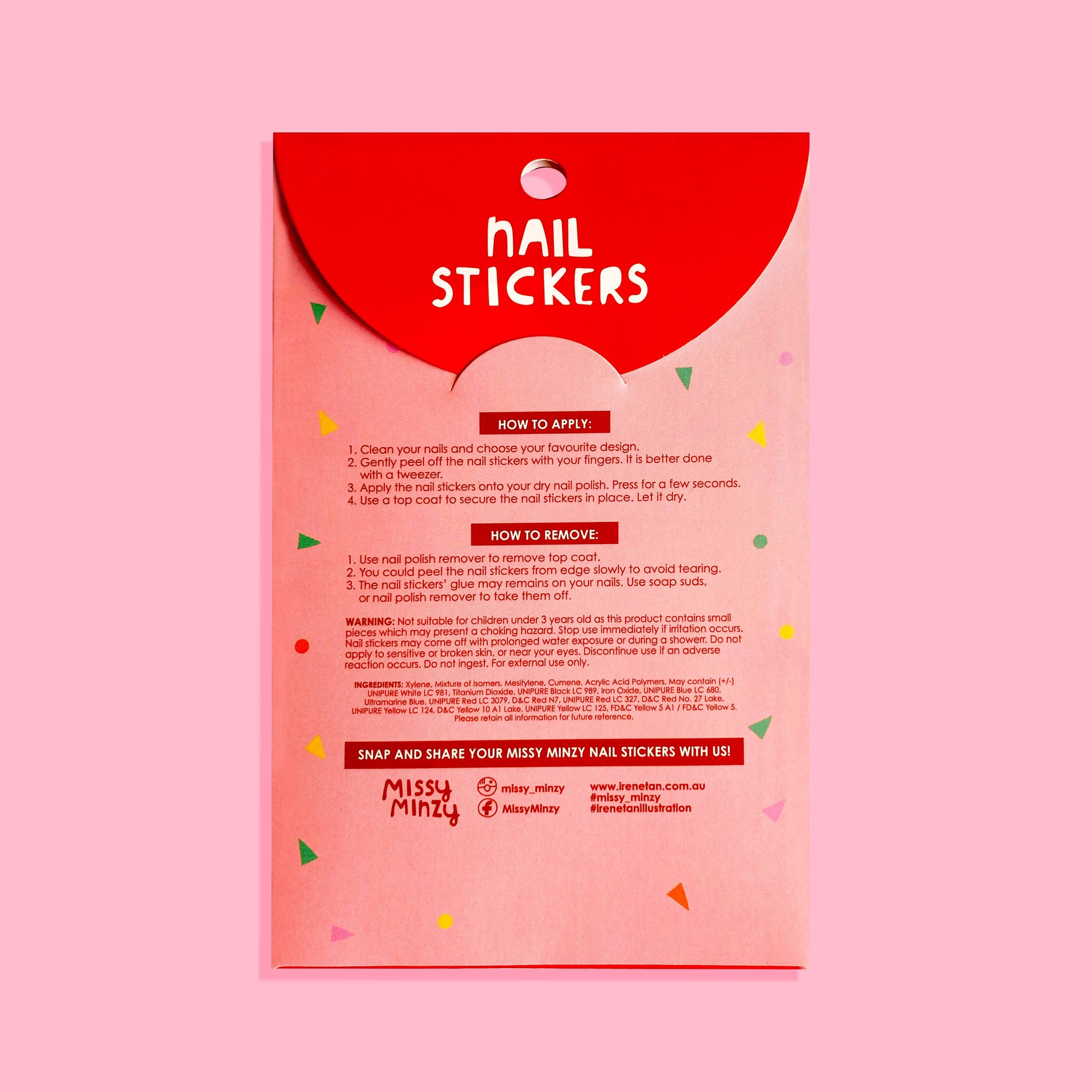Measurement of each nail stickers sheet: 8cm (W) x 10cm (H) HOW TO APPLY: 1. Clean your nails and choose your favourite design. 2. Gently peel off the nail stickers with your fingers. It is better done with a tweezer. 3. Apply the nail stickers onto your dry nail polish. Press for a few seconds. 4. Use a top coat to secure the nail stickers in place. Let it dry. HOW TO REMOVE: 1. Use nail polish remover to remove top coat. 2. You could peel the nail stickers from edge slowly to avoid tearing. 3. The nail stickers’ glue may remains on your nails. Use soap suds or nail polish remover to take them off.