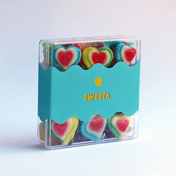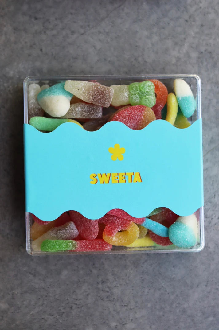 Our absolute favourite sour gummies, jumbled together and topped with the ultimate blueberry hearts. Yum, yum, yum! Cola bottles, peach hearts, gummy bears and worms!