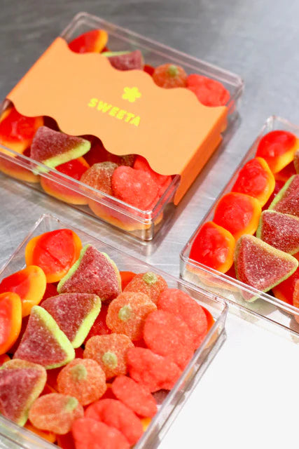 Ingredients: Maltose Syrup, Sugar, Water, Modified Corn Starch, Gelatine, Dextrose, Fruit Juice Concentrate, Acidity Regulators (296, 297, 330, 331, 334) Flavours, Gelling Agent (400) , Colours (102, 110, 129, 133, 150D, 171)