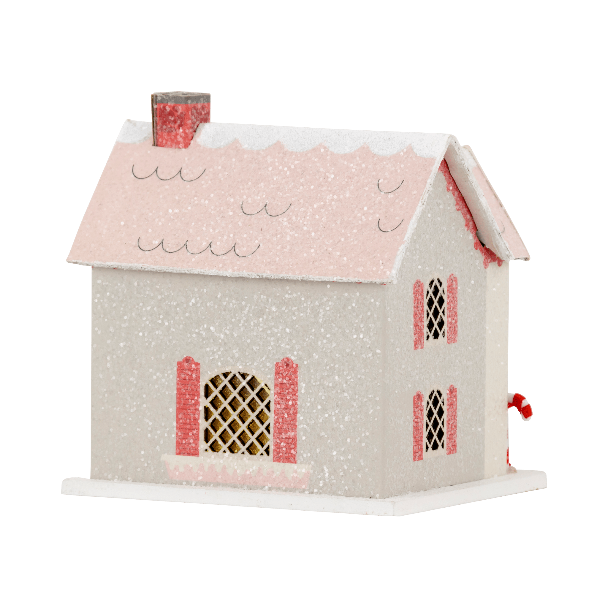 House is 4" wide x 3.5" deep x 6.5" tall * Constructed of heavyweight paperboard with glitter accents * includes battery powered light inside (please keep out of reach of small children)