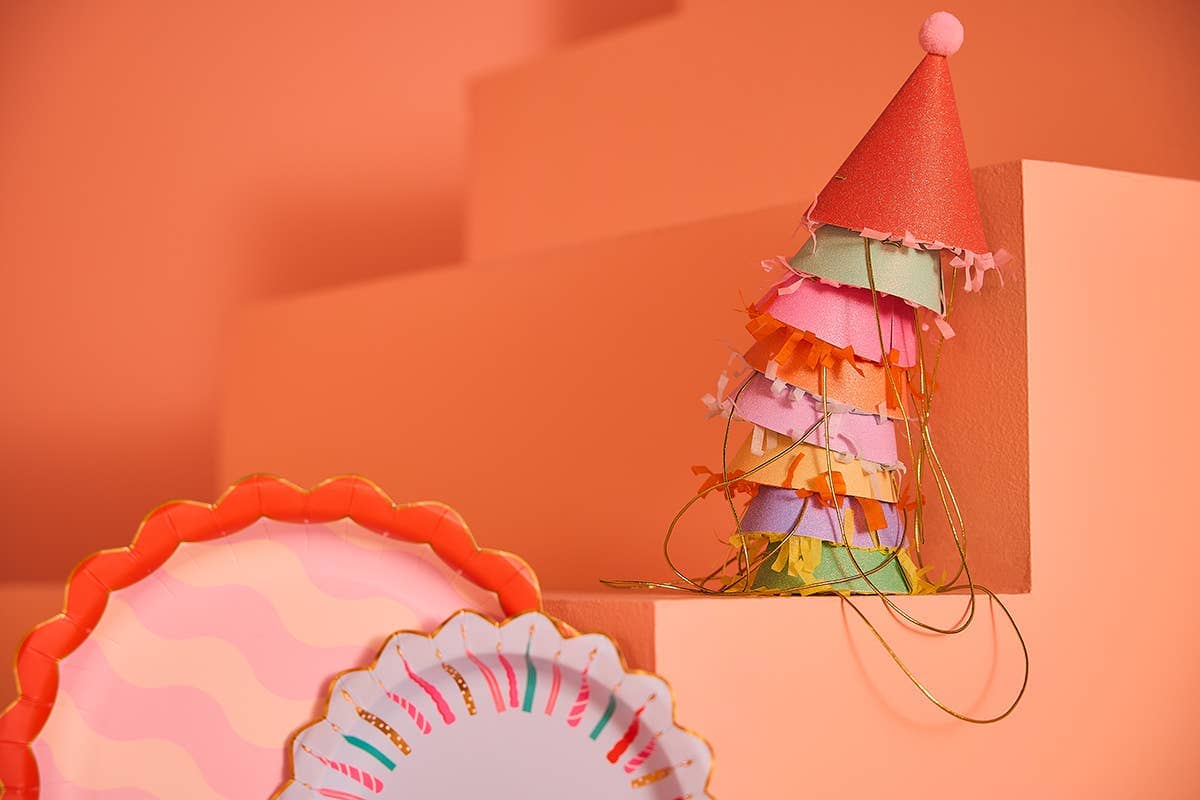 This set of 8 mini party hats brings big fun with shimmering glitter, fluffy pom tops, and stretchy gold elastic straps that make them one-size-fits-all fabulous. cute, comfy, and photo-op ready, these hats are the cherry on top of your celebration!