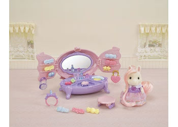 The Pony's Vanity Dresser Set features Joy, the pink-haired Pony girl, and includes a compact mirror that opens up to reveal a dresser with shelves and a mirror. The set comes with a variety of hair accessories and beauty items which can be stored inside the dresser. The ribbon puff in the centre acts as a stool for the dresser and can also be used to display accessories.